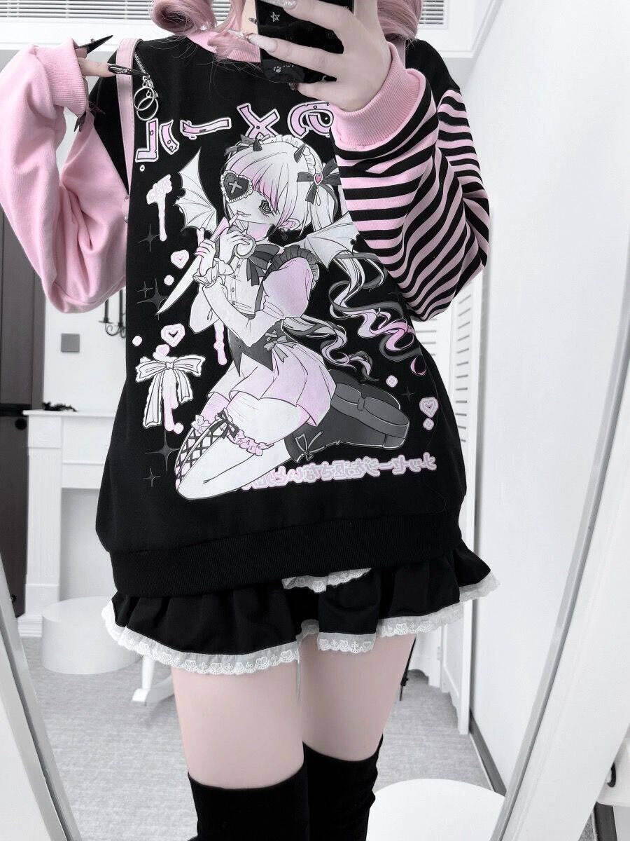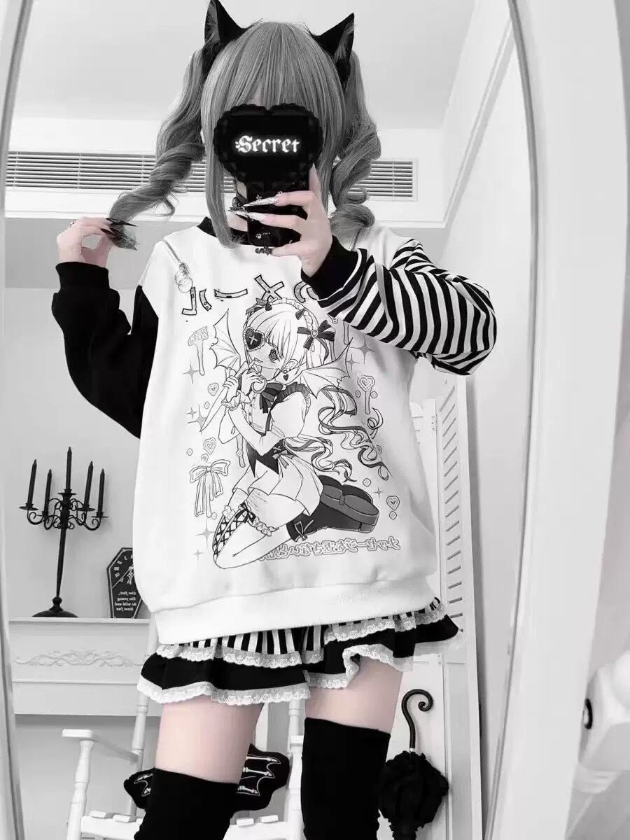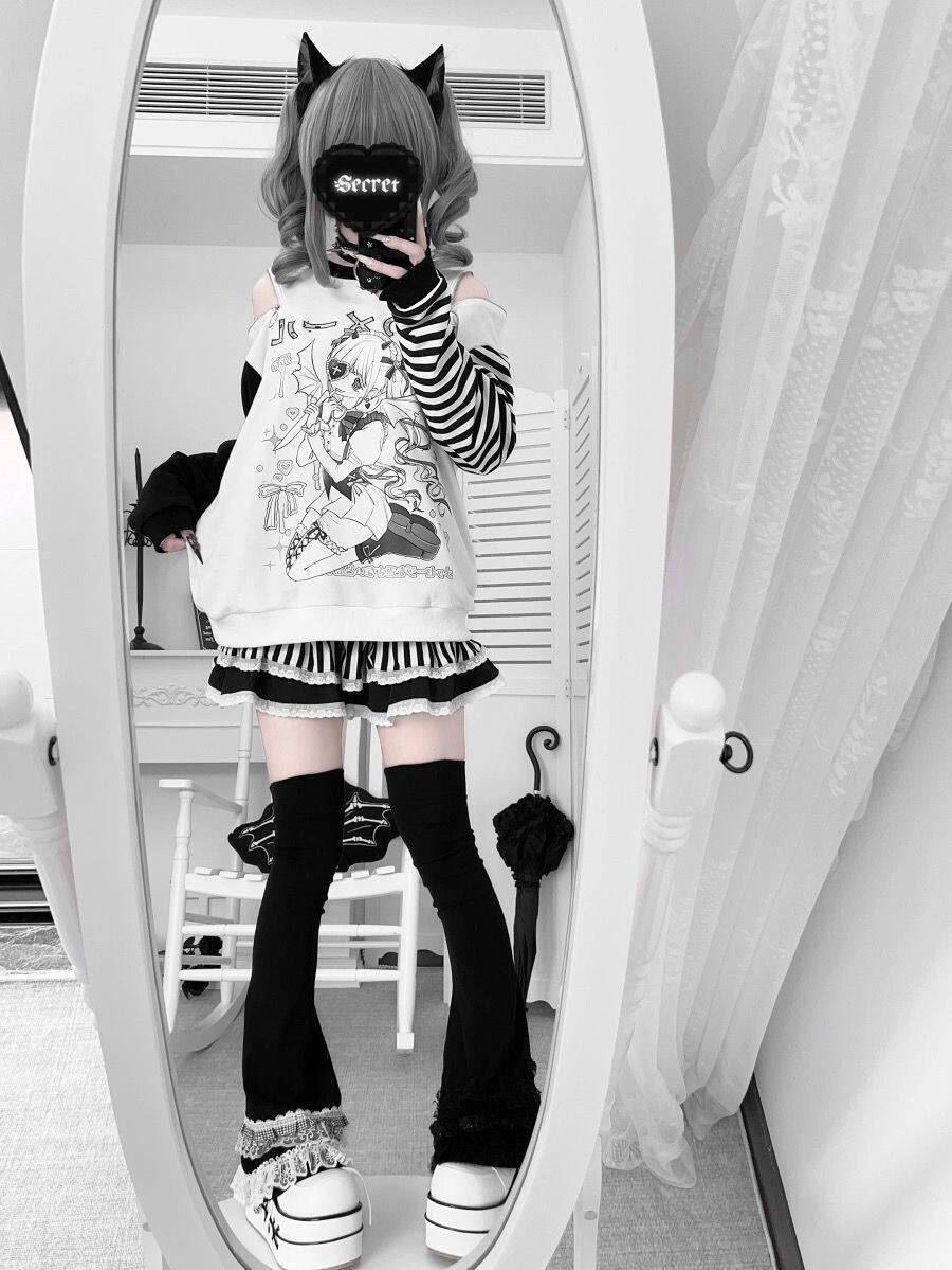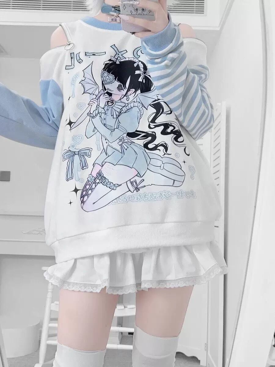 Myurina メンヘラオフショルダースウェット 肩出し 地雷系 プルオーバーパーカー病みかわ サブカル系 メンヘラ 韓国ファッション 00s 水色界隈 肩あき ルーズシルエット スウェット