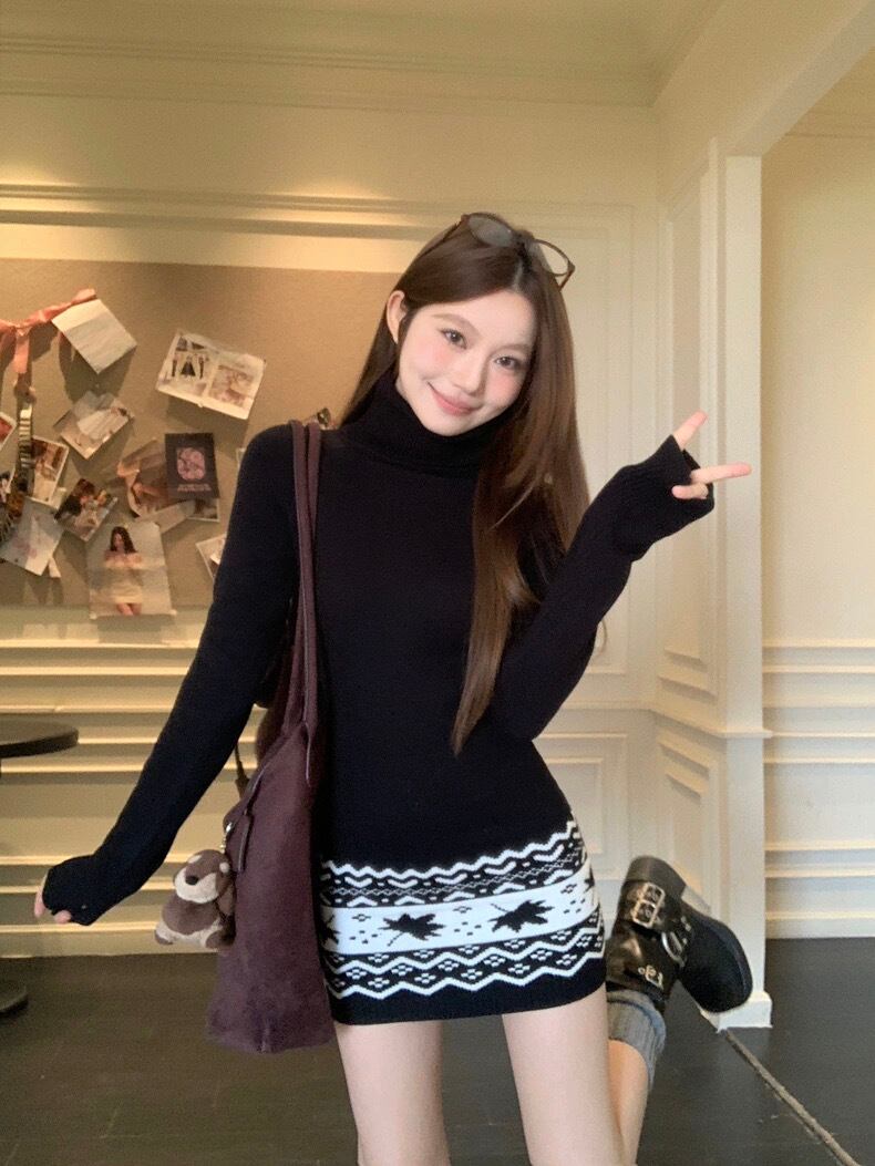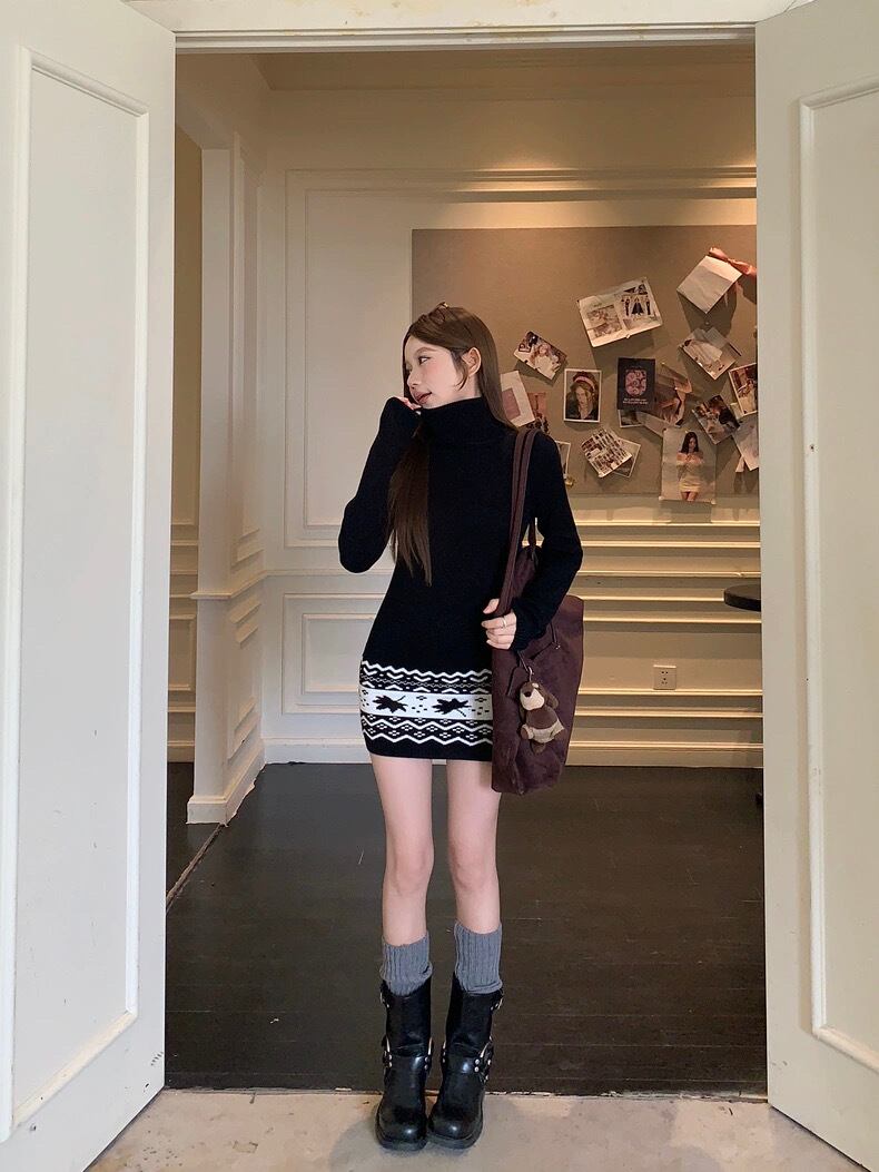 Myurina ノルディック柄ニットミニワンピース 雪柄 ジャガード編み Y2K ストリート サブカル系 ゆるだぼ オーバーサイズ ルーズシルエット 冬コーデ 韓国ファッション