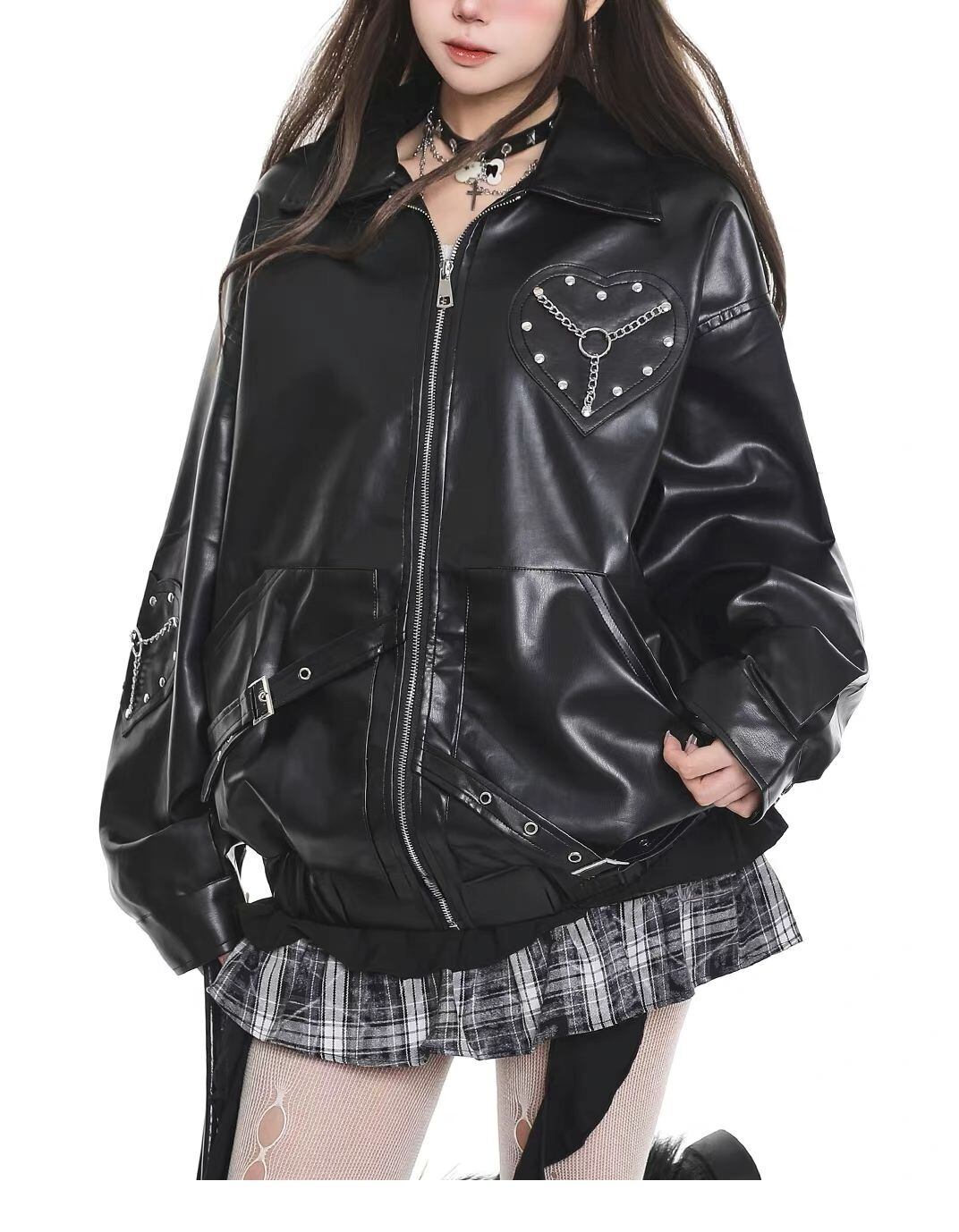 Myurina パンクガーリーレザージャケット ライダースジャケット パンク 地雷系 フェイクレザー PUレザー スプリングジャケット サブカル系 モード系 甘辛ミックス 韓国ファッション ショート丈