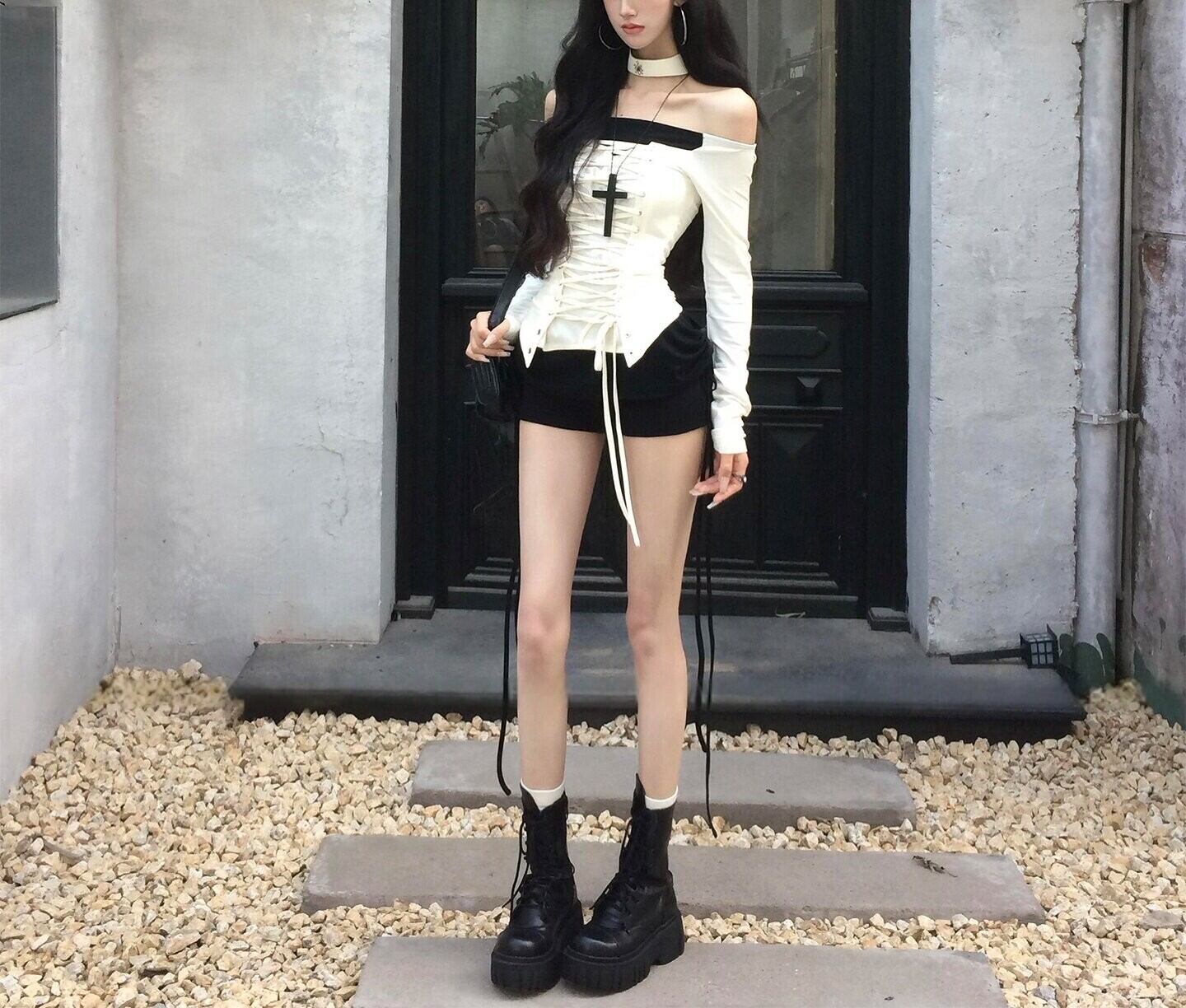 Myurina オフショルレースアップロンT 編み上げデザイン Y2K ストリート ピチT サブカル系 地雷系 パンク グランジ 韓国ファッション チビT ショート丈