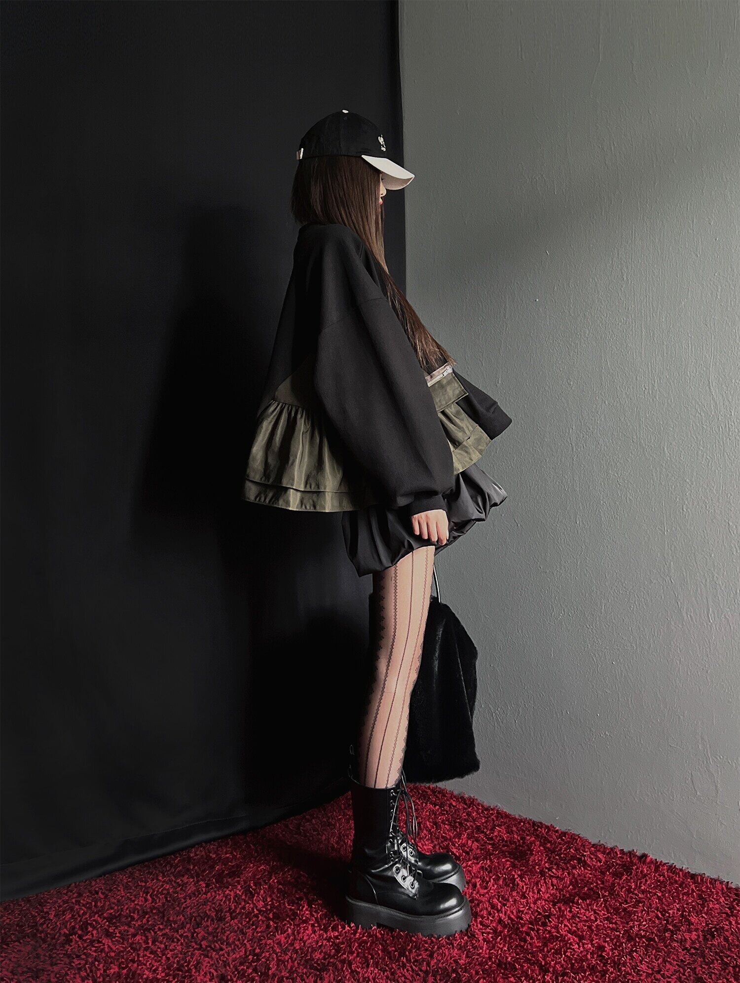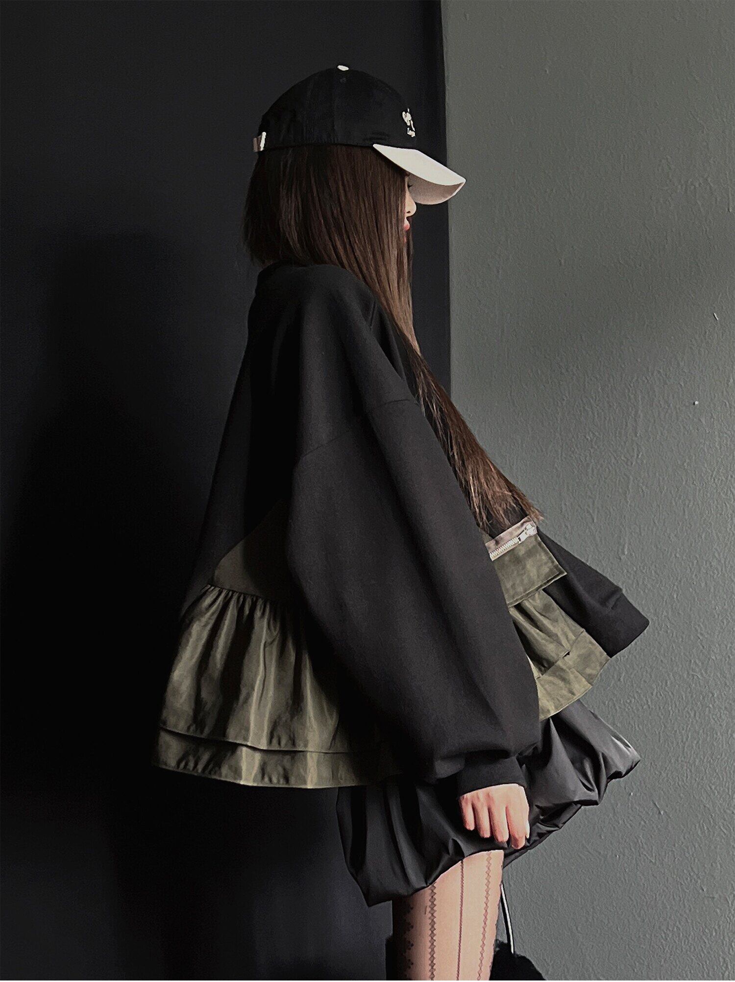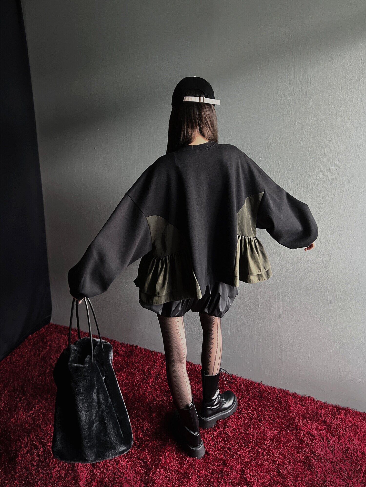 Myurina バイカラーフリルバルーンスウェット モード系 大人カジュアル トレーナー ビッグシルエットシャツ 体型カバー ティアードトップス バイカラー 異素材MIX 個性的シャツ ストリート系 綺麗め 韓国ファッション